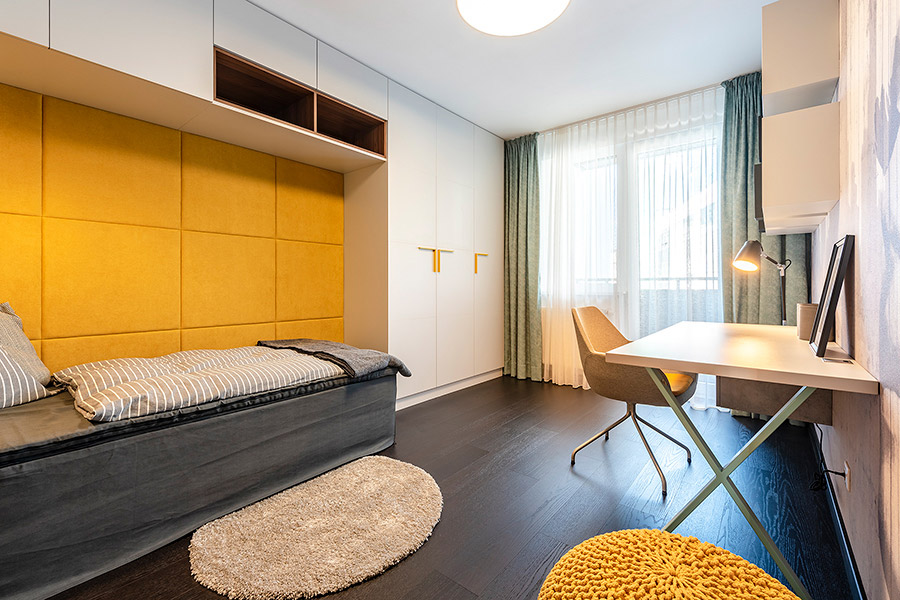 Štvorizbový byt na prvom poschodí sa podľa Andreja Gajdoša najviac hodí pre rodinu s viacerými deťmi. Tomu zodpovedá aj jeho zariadenie. „Mojou víziou bolo, aby pôsobil elegantne, no pritom pohodlne. Bledé drevo a svetlejšie zemité odtiene byt ladia do škandinávskeho štýlu,“ vysvetľuje architekt.