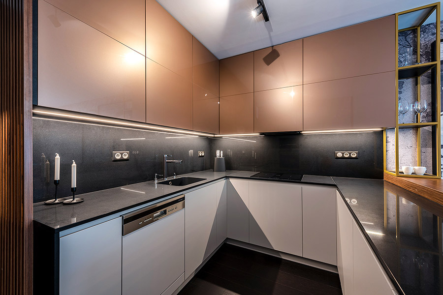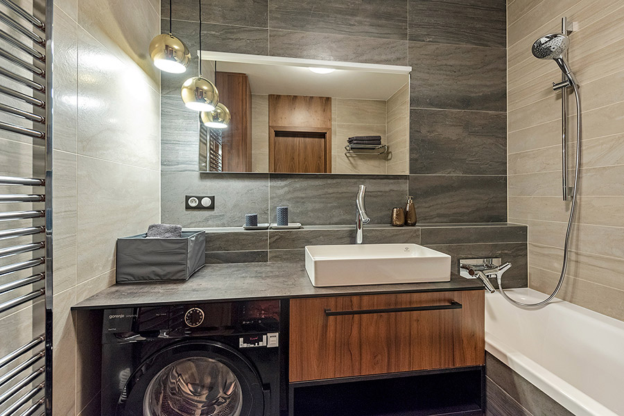 Už pri vstupe nás prekvapí nadštandardne priestranná hala. Po celej jej dĺžke sa tiahne šatníková zostava zo zrkadlovou časťou. Nepôsobí ale prázdne ani neosobne. „Chodba by nemala byť iba miestom, kde odhodíte topánky. Je prvým kontaktom s bytom. Celý ho drží pohromade ako nosná konštrukcia, pretože sa z nej, ako je dnes trendom, vchádza do každej ďalšej miestnosti,“ vysvetľuje Andrej Gajdoš. Priestor však nie je len o emóciách, ale aj o praktických riešeniach: „Doplnili sme ho jednoduchým umeleckým prvkom, obrazom nad širokou, modrozelenou taburetkou. Nevisí tam len na ozdobu, dômyselne skrýva to, čo v byte nikto nepotrebuje vidieť – merače a rozvody,“ dodáva architekt.